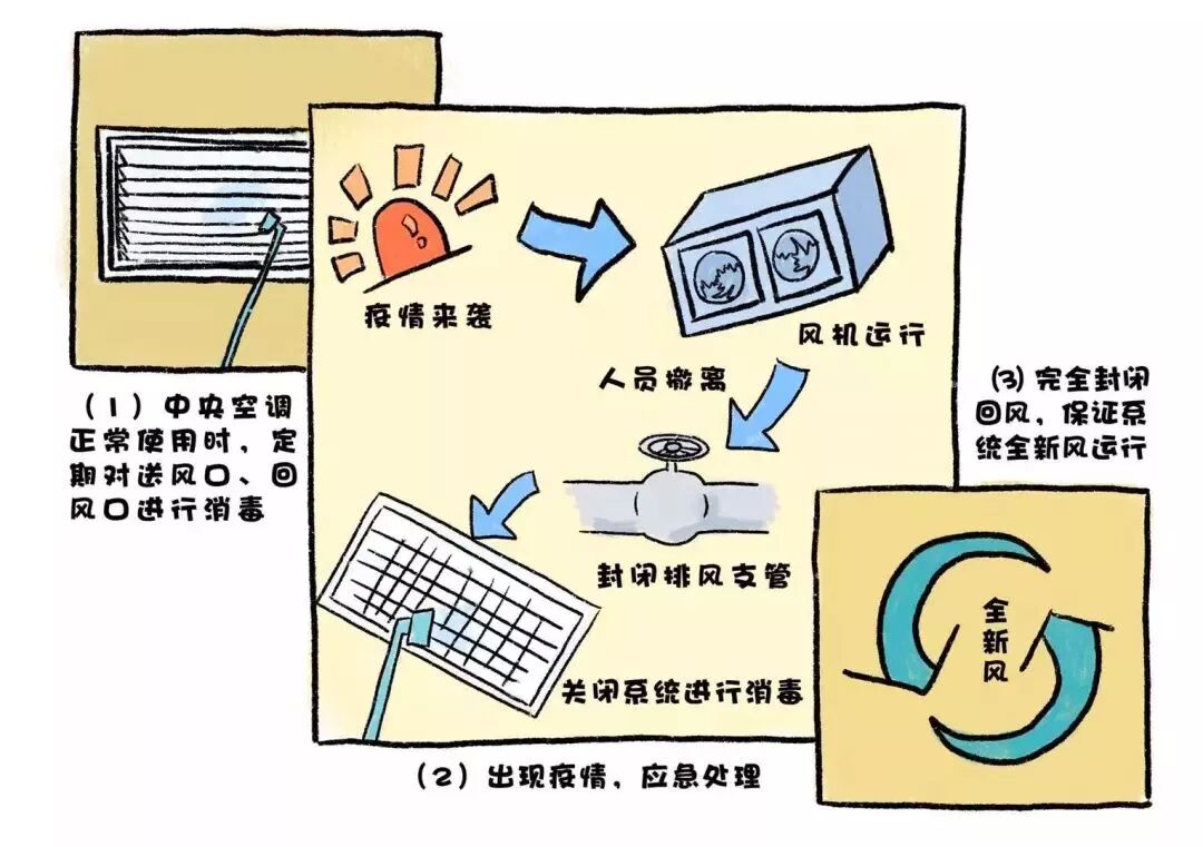 2、中央空调新风系统正常使用时,若出现疫情,不要停止风机运行,应在人员撤离后,对排风支管封闭,运行一段时间后关断新风排风系统,同时进行消毒。