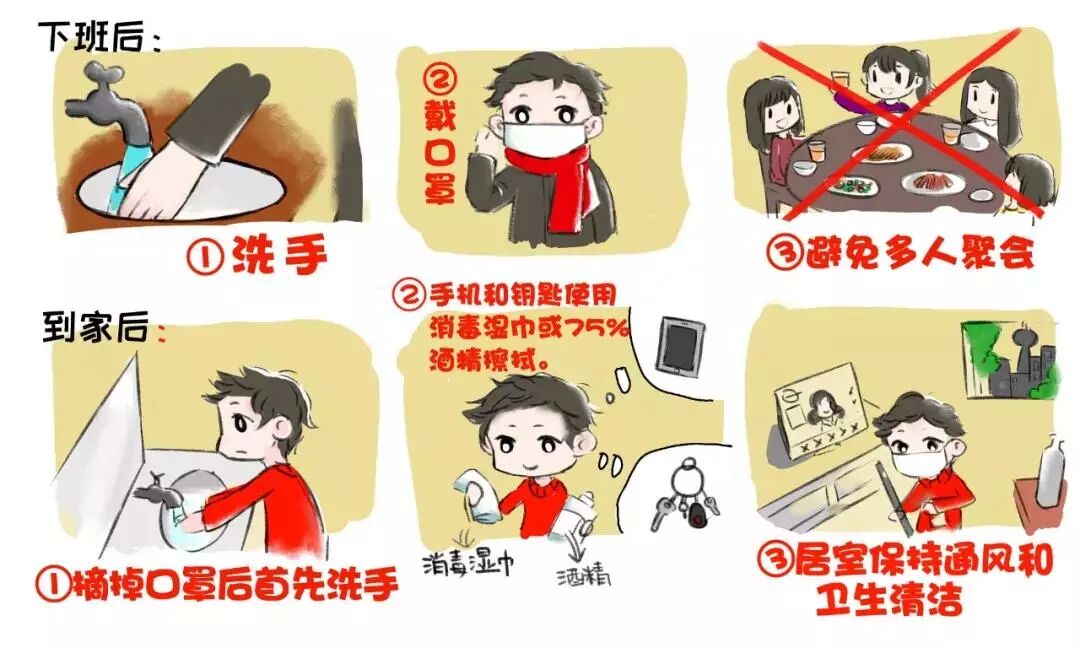 洗手后佩戴一次性医用口罩外出,回到家中摘掉口罩后先洗手消毒。手机和钥匙使用消毒湿巾或75%酒精擦拭。居室保持通风和卫生清洁,避免多人聚会。