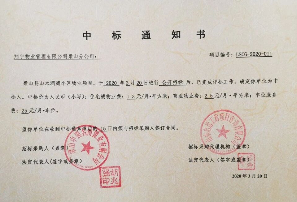 人勤春来早 备耕春耕忙 一年春耕时 在有序推进疫情防控和复工复产 两手抓、两手硬的同时 面向市场,深耕市场 又双叒叕,传来喜报 翔宇物业本次中标项目为梁山山水润德小区物业管理项目,小区位于梁山县水泊南路与水浒大道两条城市交通主干道的交汇处,衔接老城与新城,地理位置独一无二。项目紧邻2000亩梁山泊湿地公园和国家4A级梁山风景区。本项目规划分三期开发,目前一期正在施工建设中。项目一期规划6栋小高层住宅,建筑面积75417.95平方米,可容纳460余户居住。公司聘用专业设计院参与规划设计,项目以新中式建筑风格为设计基调,通过小区内部景观与湿地公园景观完整的对话,同时融合自然资源及建筑语言,打造梁山中式人居样板。 公司历经十五年的发展 逐梦前行 苦练内功 不断进步与提升 所服务的物业管理项目被评为 “市级物业管理示范项目” 多个项目已被授牌 “枣庄市物业管理示范(优秀)项目” 公司也屡次被授予